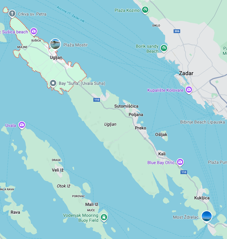 During our vacation we went for a bicycle ride on the island Ugljan starting in Zadar. We took the ferry in Zadar to the island and then cycled around on the island. The city of Zadar has some bike paths but they are not in very good shape, often very narrow with a lot of holes and bumps and used in 2 directions. Also, they are not well indicated so it is not always clear if you are on a bikepath or a footwalk. In the marina we were biking according to instructions on bike paths crowded with pedestrians. Same on the island on the road along the coast which was supposed to be a bike path but naturally was used by all swimmers and sunbathers as well. As a result our average speed was very low. But we compensated by taking some shortcuts where necessary as our tour also tooks us along not very bike friendly roads. At lunch time we stopped at the Konoba Ugljan in the town of Ulgjan. It was a nice restaurant with an open fire grill and we had grilled octopus for the first time in Croatia. Food was really great but the price we paid was also the highest so far on our vacation. We sat outside, under a roof in the shade, which was very welcome as the sun was burning. Some cold water and beers were welcome refreshments to accompany the excellent food. If you are not on a tight budget I can definetly recommend it. After lunch we continued cycling and stopped at some point to watch planes flying over the sea to pick up new water to fight a fire on the mainland. The fire was very far away and we could not see it but we could definitely smell the smoke in the air and we were cycling in the general direction of the fire. As the remainder of the road was not very interesting we decided to turn back to make sure we would be in time to catch the next ferry .